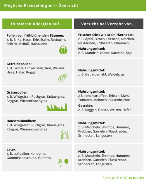 Allergische Kreuzreaktionen treten zusätzlich dann auf, wenn diese Epitope sich auf (teilweise völlig unterschiedlichen) Allergenen ähnlich sind. Dann binden die (allergisch bedingten) Antikörper auch an diese und rufen eine allergische Reaktion aus. Ein Beispiel ist die Reaktion auf Birkenpollen (=Hauptallergen Bet v1) und auf Äpfel (Mal d 1). So kann bei einem Birkenpollenallergiker plötzlich ein Orales Allergiesyndrom mit Anschwellen, Rötung und Juckreiz der Mundschleimhaut auftreten.